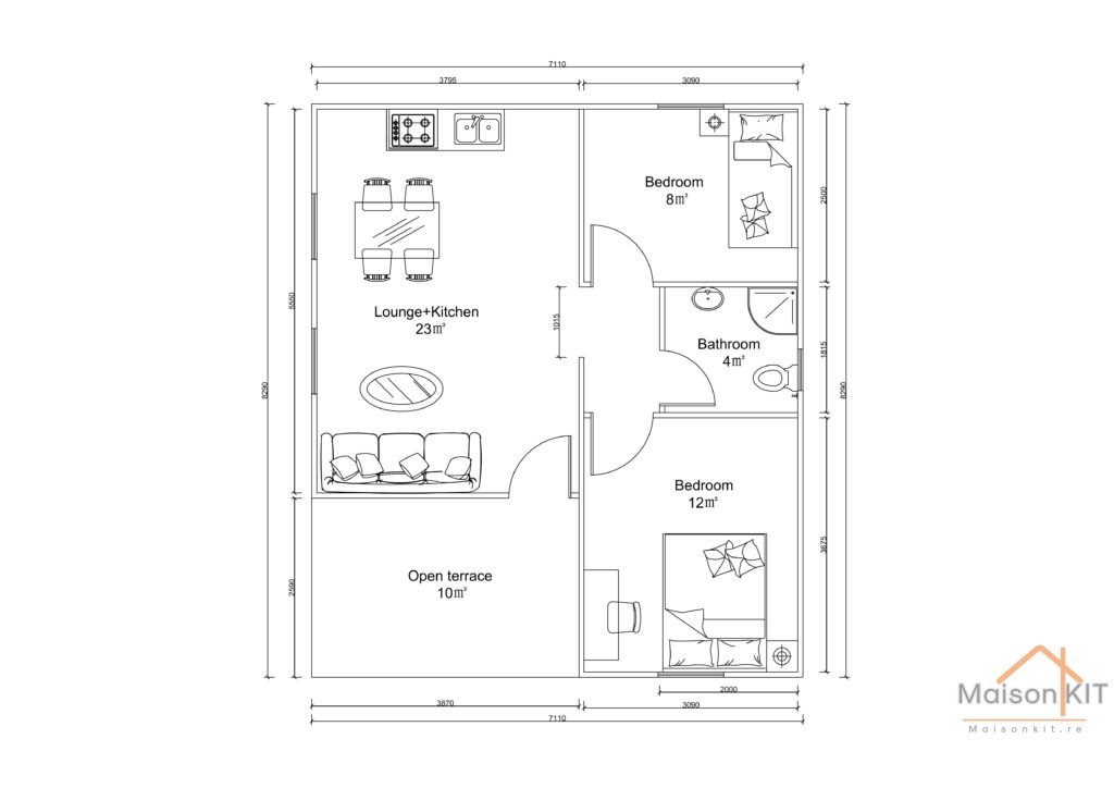 • Dimensions extérieures : 8 290 mm × 7 110 mm × 4 000 mm